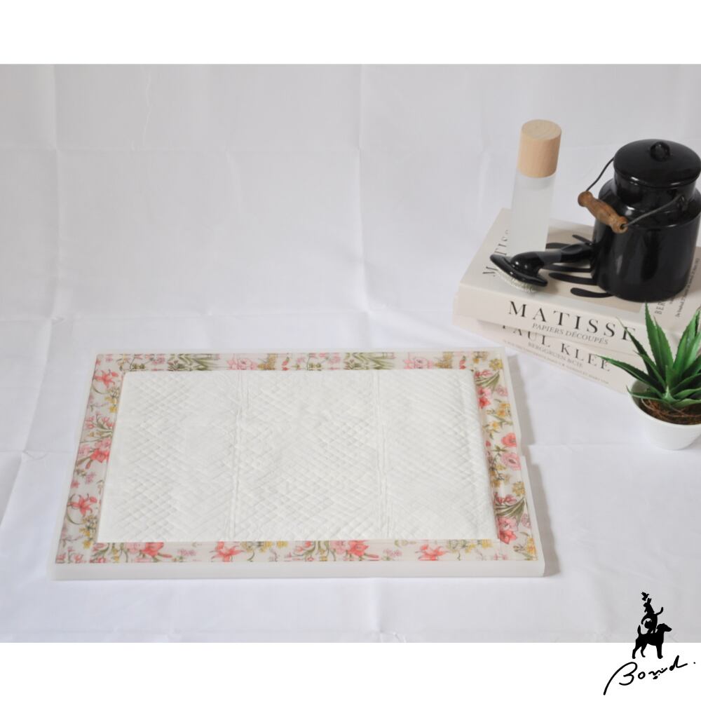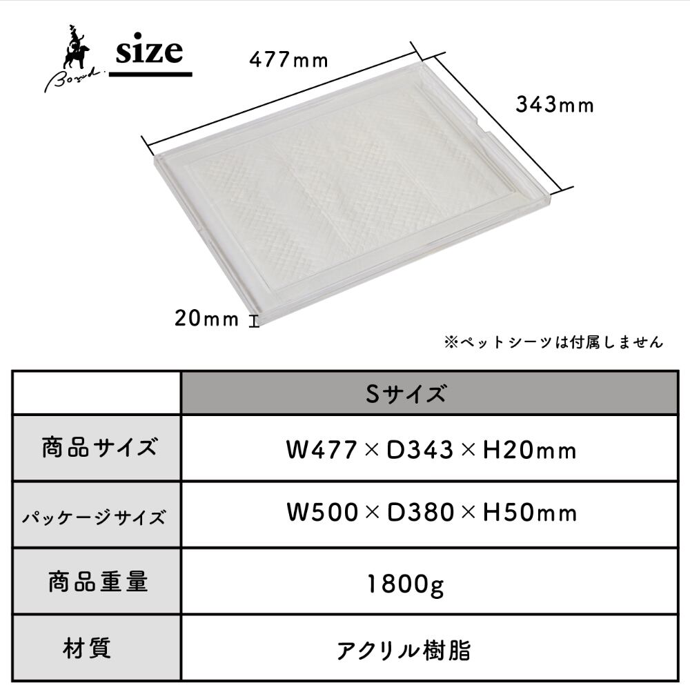 トレーにペットシーツ(レギュラーサイズ)を敷いて枠をはめ込むだけのシンプルで使いやすいアクリル製ペットトイレ。枠には適度な重みがあるため、ペットがトイレを使用する際にペットシーツがずれにくくなっています。
