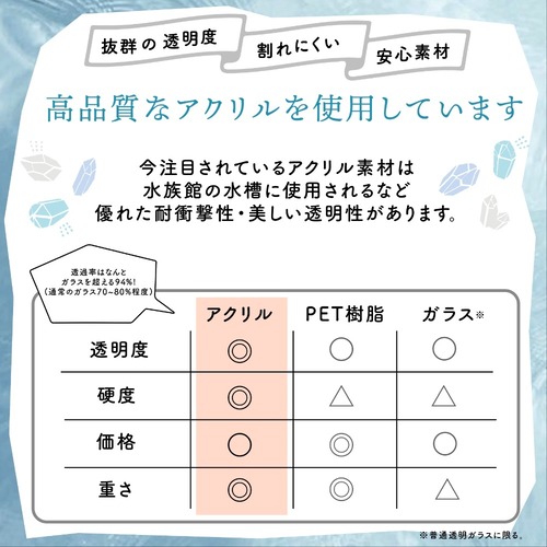 ※実はアクリルは無機ガラスを越える光線透過率を有し,年月を経ても透明度が大きく低下することがありません。アクリルの比重はなんと、ガラスの約半分。耐衝撃強度は無機ガラスよりもはるかに大きいため、軽くて強い現在注目の素材です。