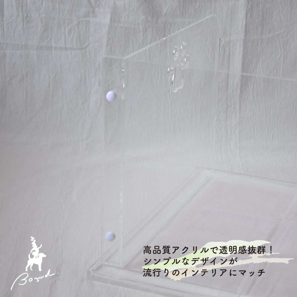 また、アクリルはガラスに比べ割れにくく、長期間使用しても劣化しにくい素材です。そのため、見た目の美しさを保ちながら、耐久性にも優れています。